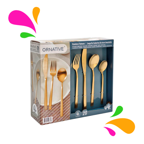 - El set incluye 4 tenedores de cena, 4 tenedores para ensalada, 4 cucharas soperas, 4 cucharitas, 4 cuchillos de cena